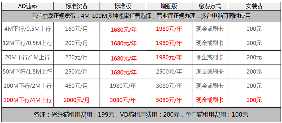 特别说明:990包年套餐不可以移机,只限1-2台终端使用。所有包年宽带安装当月费用均是按天计算,990包年宽带3元/天,套餐费用安装好后次月才开始生效!